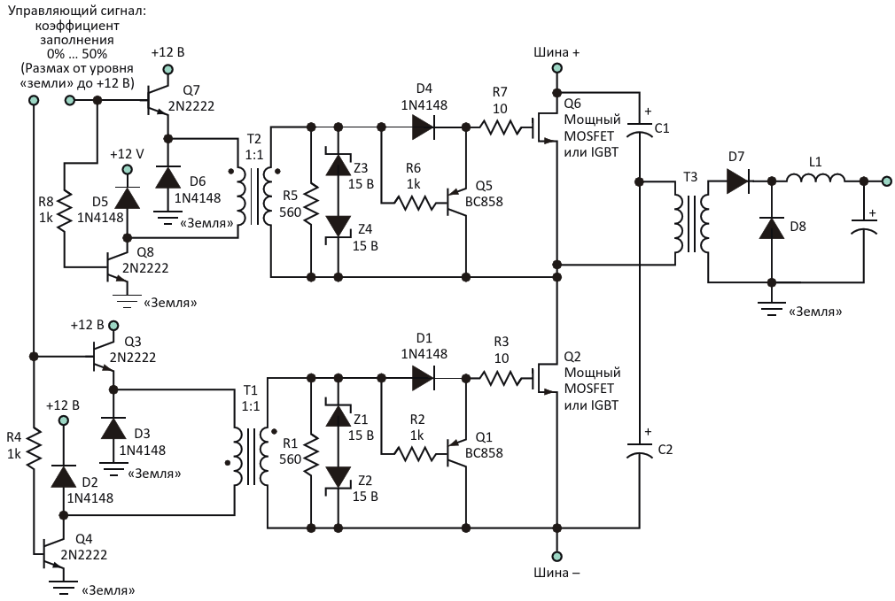 В типичном приложении прямоходового преобразователя используются два трансформатора управления затворами с соответствующими схемами, подключенными, как показано на рисунке