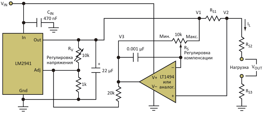 Рисунок 2. Этот вариант схемы обеспечивает отрицательную обратную связь для регуляторов, в которых используется опорное напряжение, привязанное к общей шине, например, LM2941
