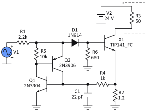 В этой схеме поимпульсного ограничения тока для управления резистивным нагревательным элементом используется сигнал ШИМ, обеспечивающий тепловую мощность, прямо и линейно пропорциональную коэффициенту заполнения управляющих импульсов