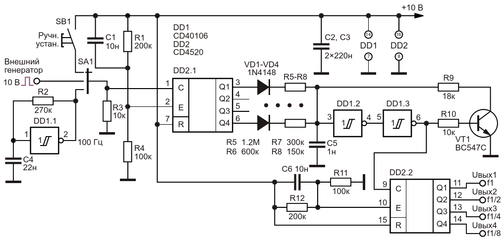 Рисунок 2. Генератор ступенчато качающейся частоты с сеткой частот f1, f1/2, f/4 и f/8