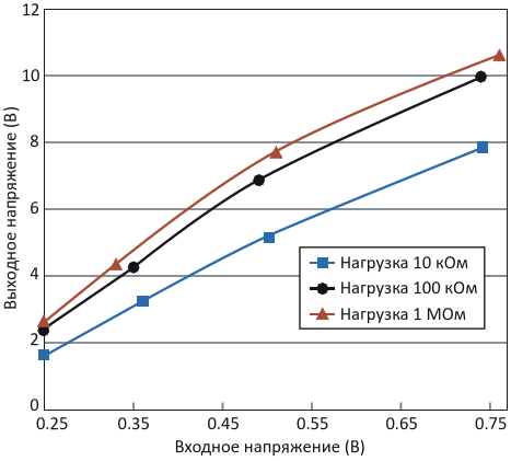 Ожидаемая зависимость среднего выходного напряжения от входного напряжения. Для легких нагрузок более 100 кОм выходное напряжение свыше 4.0 В поддерживается при входных напряжениях от 0.3 В
