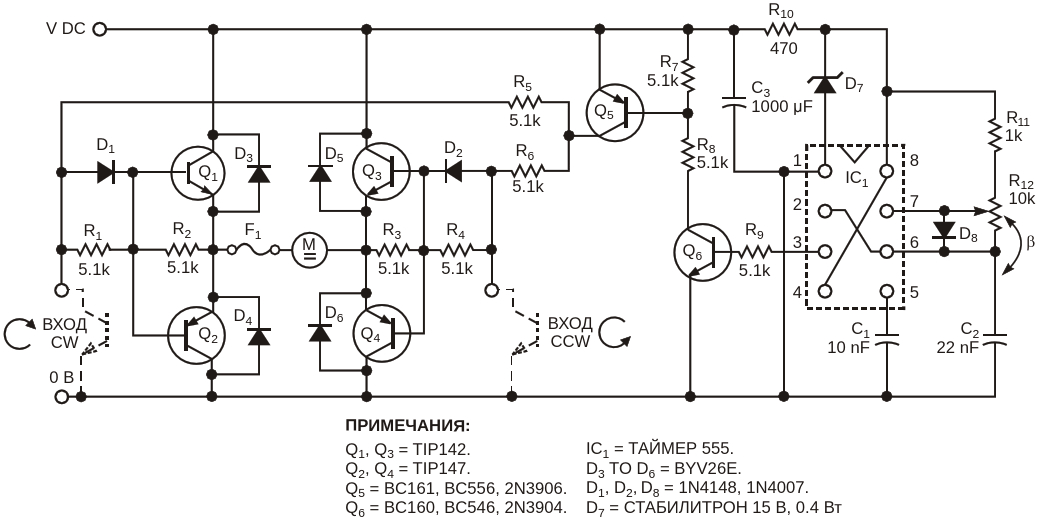 Рисунок 1. С помощью этой простой схемы можно устанавливать скорость и направление вращения двигателя