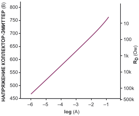 Рисунок 2. Вольтамперная характеристика показывает соответствующую зависимость дифференциального сопротивления от тока для короткозамкнутого транзистора BC337-16. (Суффиксом «-16» обозначается группа транзисторов с коэффициентом передачи тока от 100 до 250)
