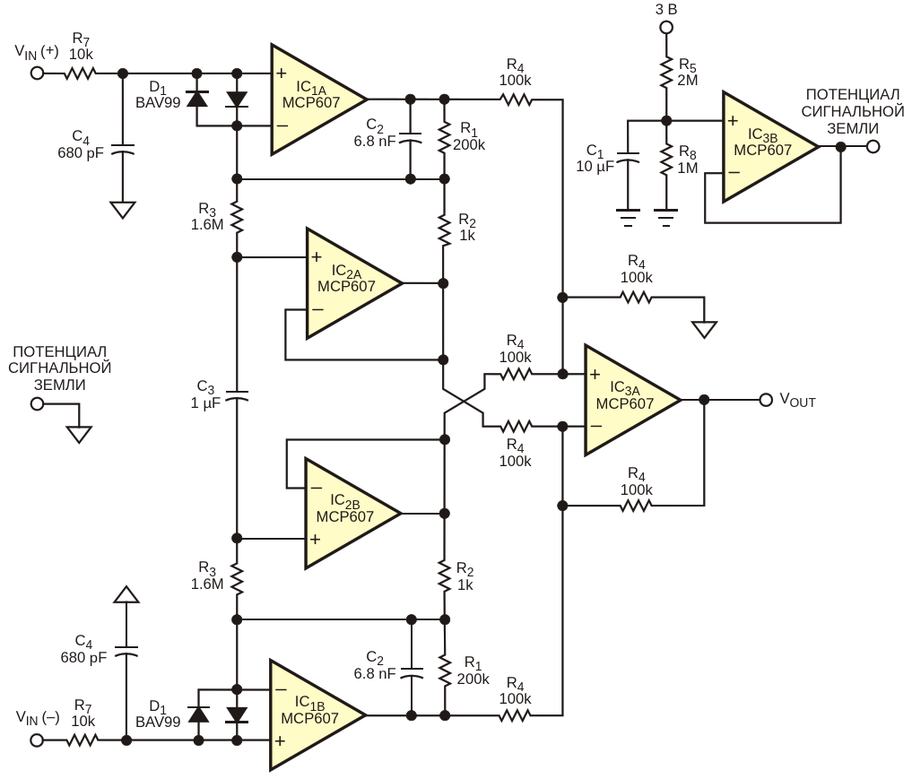 Инструментальный усилитель обеспечивает высокий CMRR при низком напряжении питания