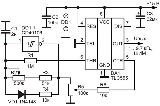 Рисунок 2. Вариант генератора прямоугольных импульсов с независимыми регулировками частоты и ширины импульсов