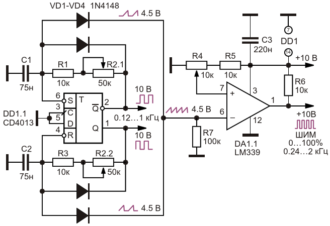 Рисунок 1. ШИМ-генератор с независимыми регулировками частоты и ширины импульсов