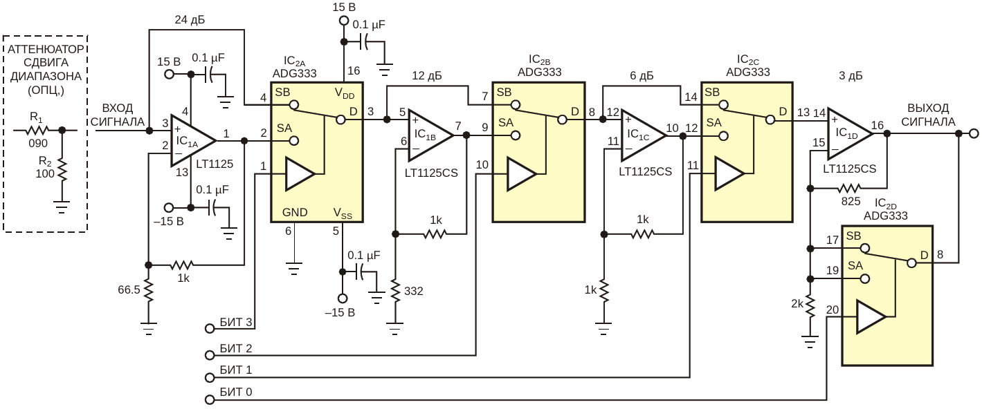 Рисунок 1. Этот усилитель с регулируемым коэффициентом усиления отличается сверхнизким шумом, большим динамическим диапазоном и широкой полосой пропускания