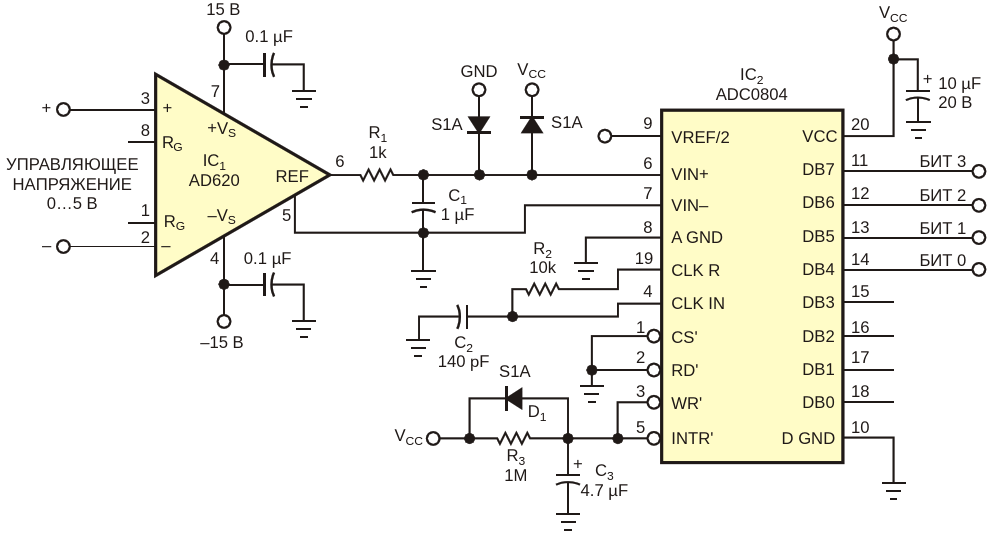 Коды, устанавливающие коэффициенты усиления схемы на Рисунке 1, формируются с помощью АЦП