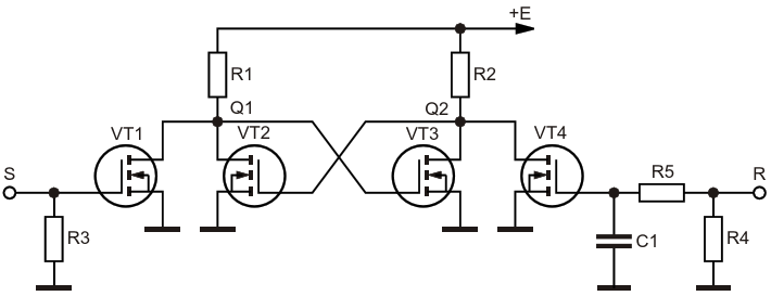 RS-триггер на транзисторах с RC-элементом задержки по входу R