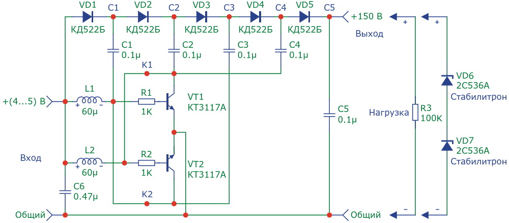 Рисунок 1. Схема преобразователя с 2-каскадным умножителем напряжения
