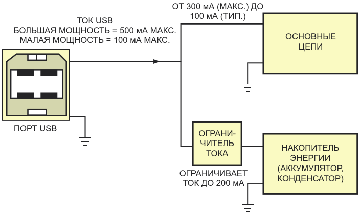 Этот типичный метод получения питания от USB-порта ограничивает ток накопительного элемента фиксированным значением, которое меньше оптимального