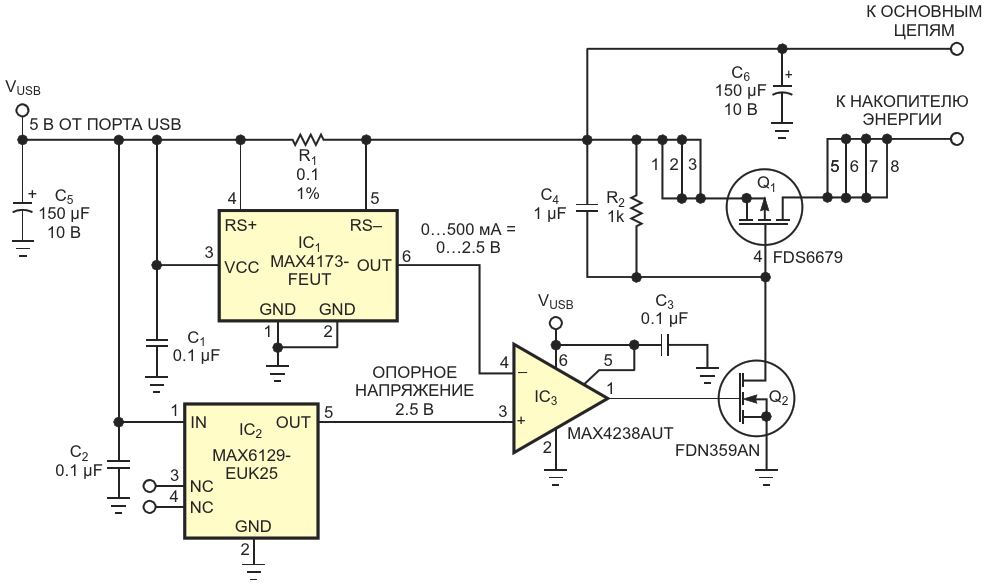 Эта схема постоянно отслеживает общий ток, забираемый из порта USB, и динамически регулирует ток накопительного элемента, чтобы не допустить превышения максимального выходного тока порта