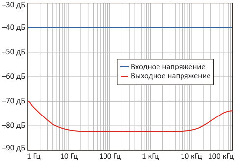 Рисунок 2. С транзисторами, показанными на Рисунке 1, подавление пульсаций питания остается хорошим далеко за пределами звукового диапазона