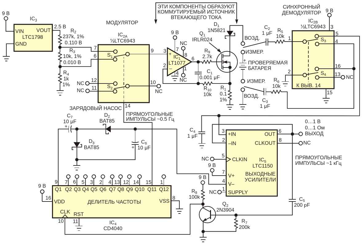 Эта схема определяет внутреннее сопротивление батареи путем многократного воздействия калиброванным разрядным током и измерения результирующего падения напряжения на клеммах батареи