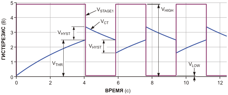 Гистерезис возникает в результате инжекции заряда из каскада 2, при котором напряжение на времязадающем конденсаторе превышает порог переключения на известную фиксированную величину