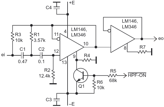 Топология фильтра ФВЧ Саллена-Ки, который можно включать и выключать с помощью дополнительного транзистора и резистора