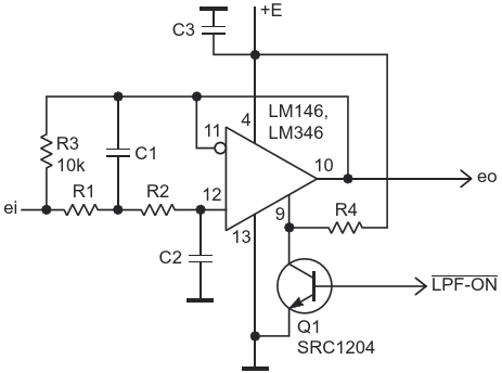 Рисунок 2. Топология ФНЧ с однополярным питанием, который может включаться и выключаться транзистором Q1 со встроенными резисторами смещения