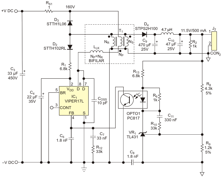 Бифилярная размагничивающая обмотка, добавленная к трансформатору обратноходового преобразователя, шунтирует выходную емкость C