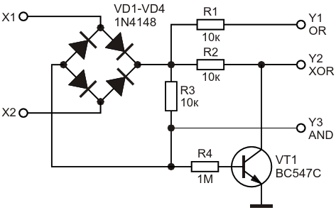 Универсальный логический элемент OR/XOR/AND на биполярном транзисторе