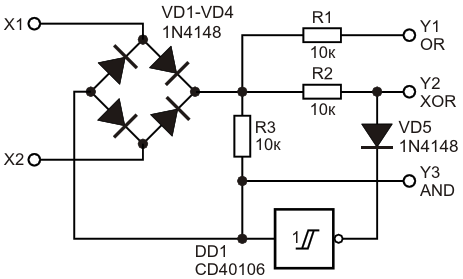 Рисунок 5. Универсальный логический элемент с использованием элемента «НЕ» (NOT) микросхемы DD1 CD40106