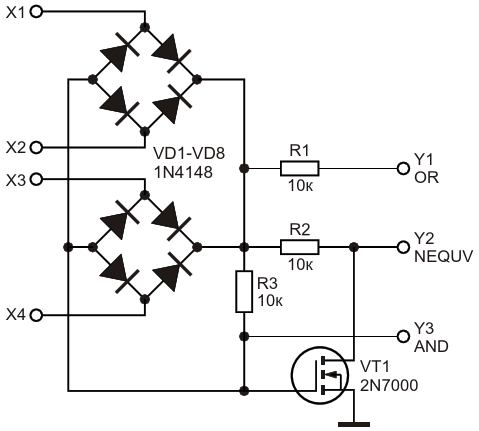 Универсальный четырехвходовый логический элемент OR/NEQUIV/AND на полевом транзисторе