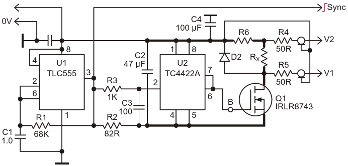 Эта схема позволяет точно измерять очень низкие значения сопротивлений путем подачи импульсов с малым коэффициентом заполнения на неизвестный резистор и на эталонный резистор с известным сопротивлением
