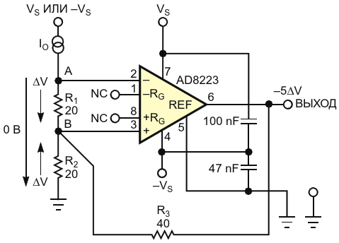 Рисунок 1. Этот инструментальный усилитель служит двум целям: он образует преобразователь ток-напряжение, с коэффициентом передачи -5R, и создает падение напряжения противоположной полярности в точке B, что позволяет поддерживать нулевой потенциал на входе A, незави
