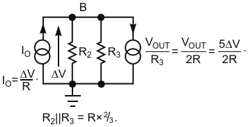 Рисунок 1. Этот инструментальный усилитель служит двум целям: он образует преобразователь ток-напряжение, с коэффициентом передачи -5R, и создает падение напряжения противоположной полярности в точке B, что позволяет поддерживать нулевой потенциал на входе A, незави