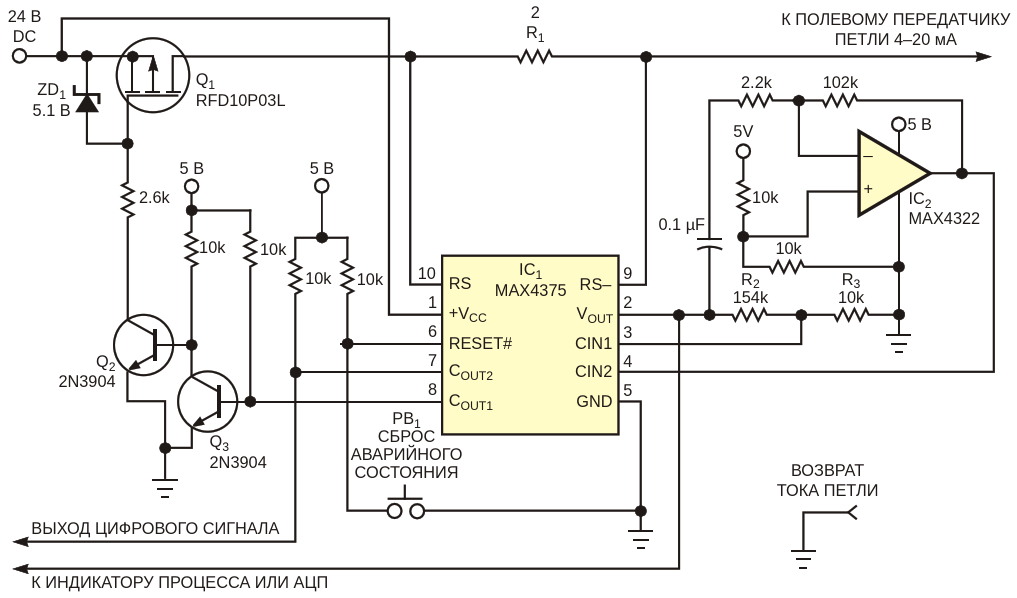 Эта схема обеспечивает защиту от замыканий и восстановление цифрового сигнала для токовой петли 4-20 мА