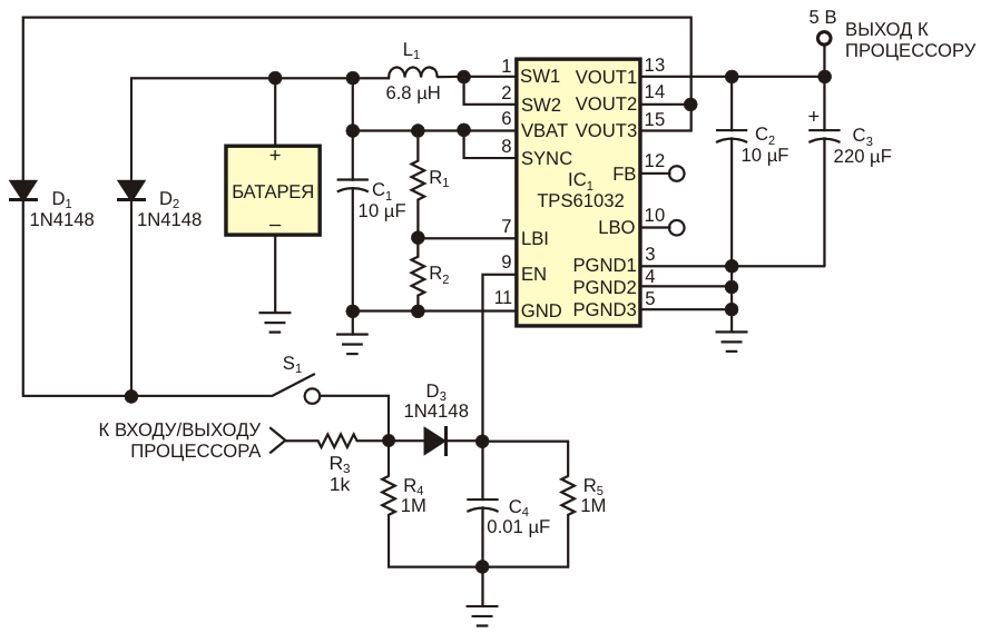 Эта конфигурация схемы обеспечивает выключение питания нефиксируемой кнопкой под контролем процессора