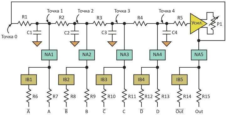 Рисунок 1. В многофазном генераторе с фиксированной частотой для обеспечения ступенчатого сдвига фаз относительно исходного сигнала используются повторяющиеся блоки