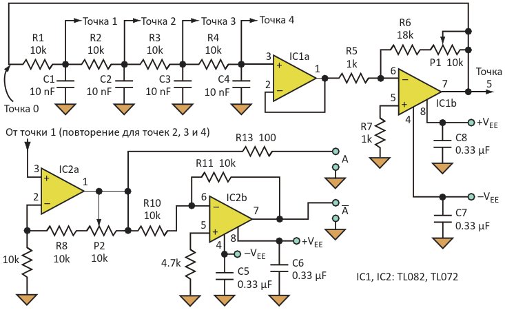 Генератор на микросхемах IC1a и IC1b имеет несколько выходов со сдвинутыми по фазе сигналами, каждый из которых буферизуется неинвертирующим и инвертирующим усилителем