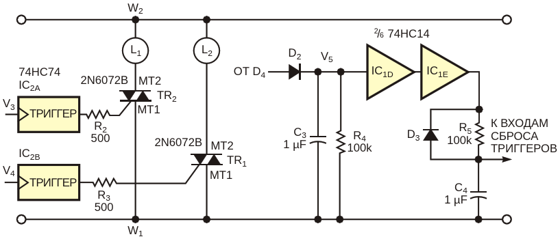 Симисторы, управляемые парой настенных выключателей, независимо коммутируют две нагрузки