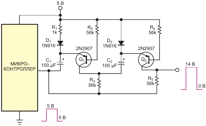 Простая схема вырабатывает одиночные импульсы амплитудой 14 В при напряжении источника питания 5 В