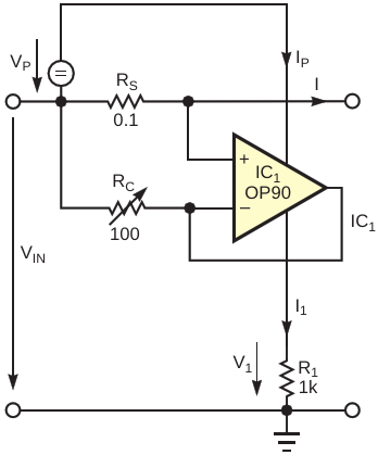 Рисунок 2. В этой схеме для измерения тока в цепи нагрузки используется ток, протекающий через вывод отрицательного источника питания операционного усилителя