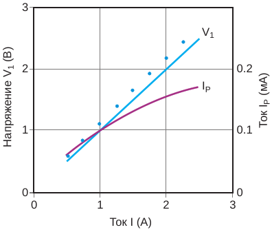 Рисунок 3. Из-за положительного тока питания измеренные значения (точки) не очень хорошо согласуются с теоретическими значениями (прямая линия)