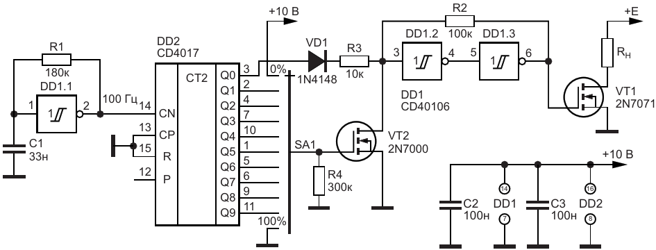 Рисунок 2. Ступенчатый регулятор мощности с использованием микросхем CD40106 и CD4017