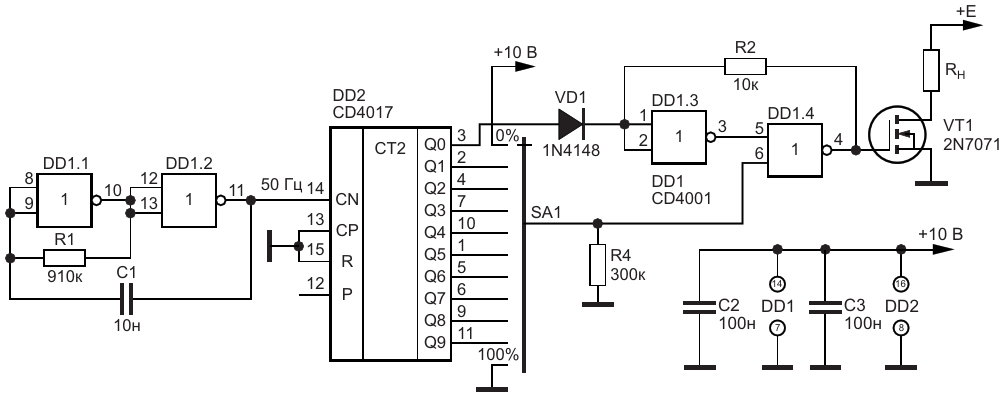 Ступенчатый регулятор мощности с использованием микросхем CD4001 и CD4017