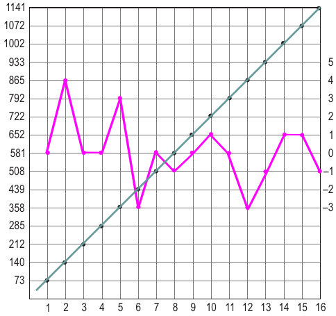 Рисунок 7. Зависимость выходной частоты от освещенности. По оси Х освещенность в относительных единицах. По левой оси Y - частота, по правой оси Y - отклонение от скользящей средней в герцах