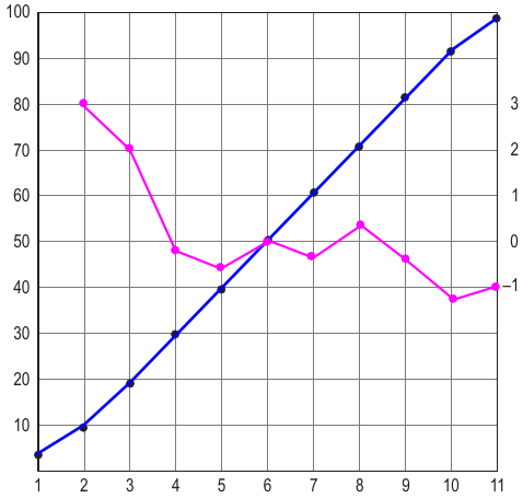 Рисунок 9. Зависимость коэффициента заполнения от освещенности при использовании в качестве фотоприемника цветного светодиода. По оси Х освещенность в относительных единицах. По левой оси Y - частота, по правой оси Y - отклонение от скользящей средней в процентах