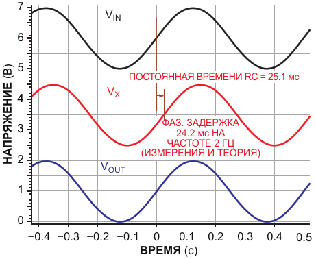 Внесенный преобразователем фазовый сдвиг синусоидального сигнала, имеющего единственную частотную составляющую, должным образом скорректирован во времени, а слегка ослабленный выходной сигнал преобразователя был восстановлен на выходе