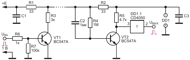 Передача цифровой информации через цепь питания с использованием транзисторных усилителей, а также КМОП(ТТЛ)-повторителя напряжения на приемной стороне