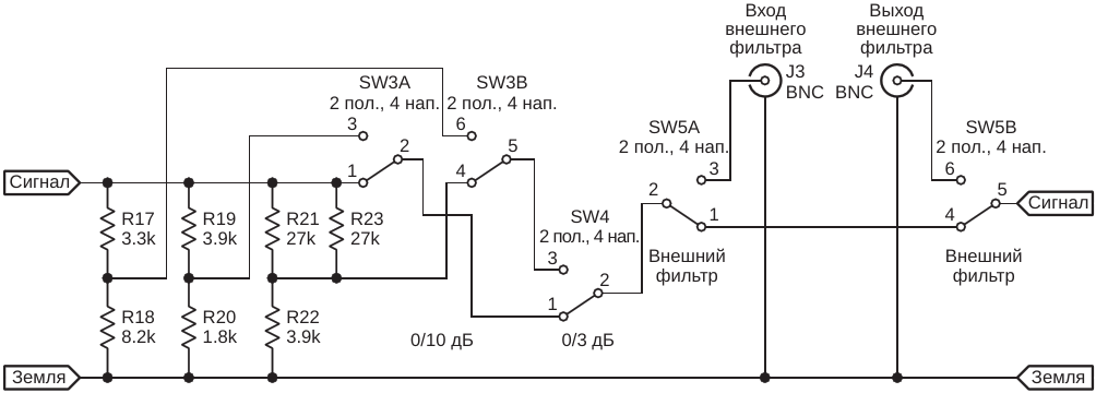 Принципиальная схема аттенюаторов 3/10/13 дБ и разъемов внешнего фильтра