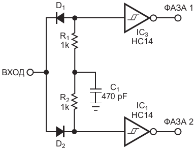 Рисунок 1. Каждый инвертор с триггером Шмитта управляется в течение одного полупериода через диод. Создаваемая RC-цепью задержка происходит во время чередования полупериодов. Резисторы с равными сопротивлениями R1 и R2 попеременно служат в каче