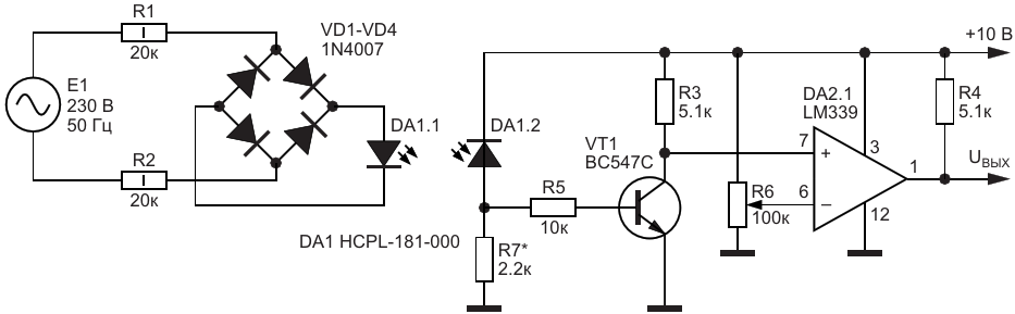 Рисунок 3. Индикатор перехода сетевого напряжения через ноль с оптоэлектронной развязкой, каскадом предусилителя и компаратора