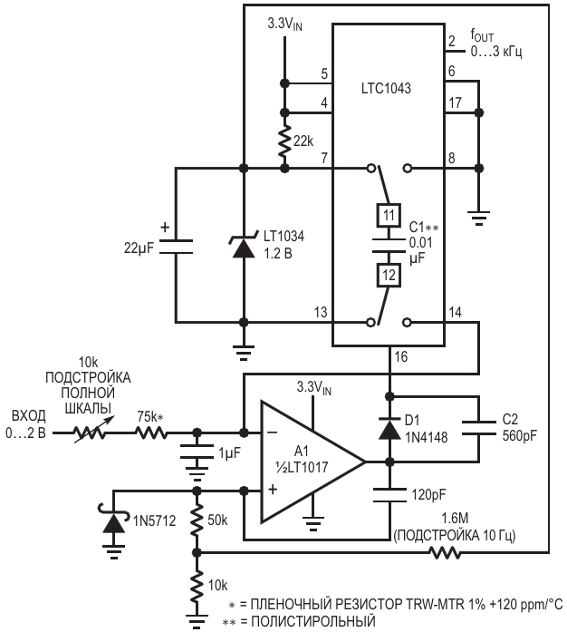 Преобразователь напряжение-частота с напряжением питания 3,3 В. Цепь обратной связи на основе зарядового насоса поддерживает высокую линейность и стабильность