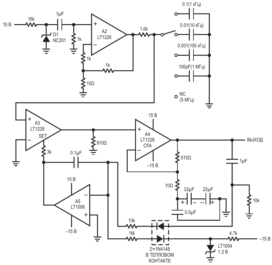 Рисунок 1. Для улучшения равномерности амплитуды спектра шумов в широкополосном генераторе случайного шума используется контур управления усилением
