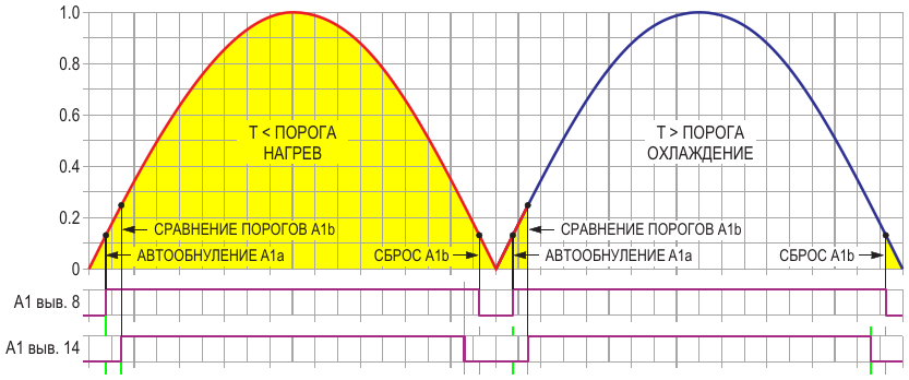Цикл измерения/регулирования температуры с двумя циклами работы термостата по 8.33 мс, где каждый из этих циклов состоит из четырех этапов: автообнуление, сравнение порогов, нагрев/охлаждение и сброс A1b