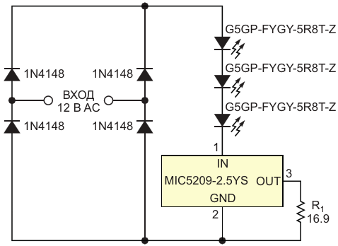 Основой ограничителя тока светодиода является недорогой стабилизатор напряжения