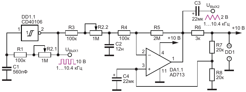 Вариант генератора импульсов прямоугольной и треугольной формы с перестройкой частоты от 1.0 до 10.4 кГц